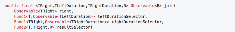 join合并两个序列,称为“left(左)”和“right(右)”。该方法不是静态(static)的,在方法签名中,我们可以看到两个名为leftDurationSelector和rightDurationSelector的方法,它们将相应序列的项作为参数。它们返回一个定义持续时间(即window)的observable。这些window用于选择要配对的值。配对的值将传递给resultSelector函数,该函数将它们组合成单个值,就像zip中的resultSelector一样,该值将由join发出。