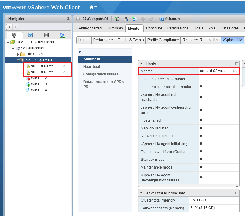 上图:这个SA-Compute-01集群中,有两台主机:sa-esxi-01.vclass.local、sa-esxi-02.vclass.local,经过“选举”,sa-esxi-02.vclass.local变成集群的Master。