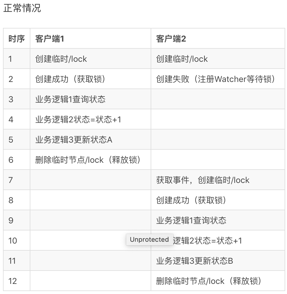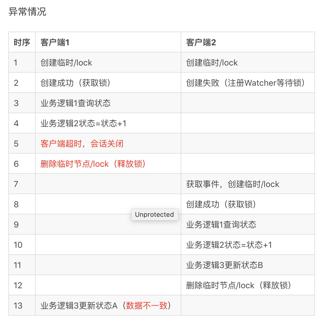 一句话总结:如果因为zk服务端-客户端网络中断导致锁提前释放,但业务逻辑可能会依然并发执行。