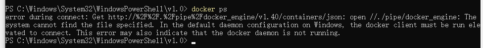 error during connect: Get http://%2F%2F.%2Fpipe%2Fdocker_engine/v1.40/containers/json: open //./pipe/docker_engine: The system cannot find the file specified. In the default daemon configuration on Windows, the docker client must be run elevated to connect. This error may also indicate that the docker daemon is not running.