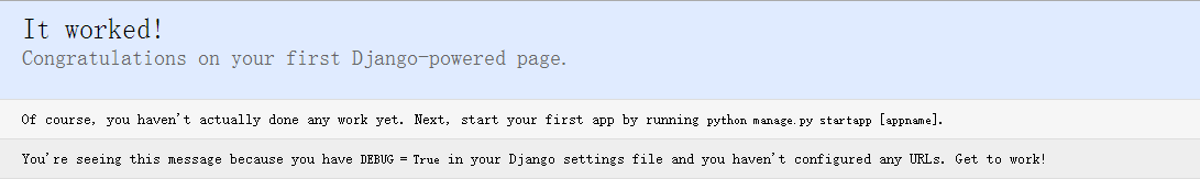 现在这个程序正在运行, 用你的浏览器访问 http://127.0.0.1:8000/ 你将看到 “Welcome to Django”页面, 令人愉快的浅蓝色,它工作了!【下图为我个人截图,为了读者能更直观感受到Django的魅力】