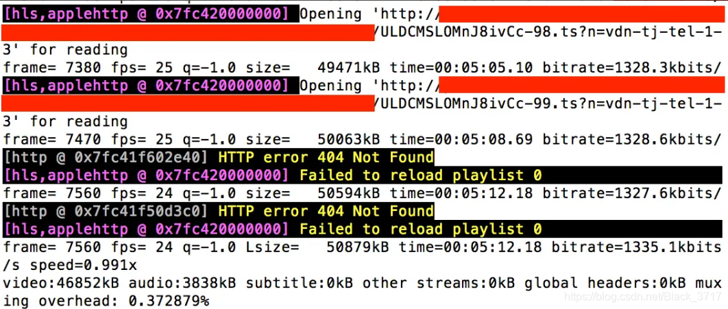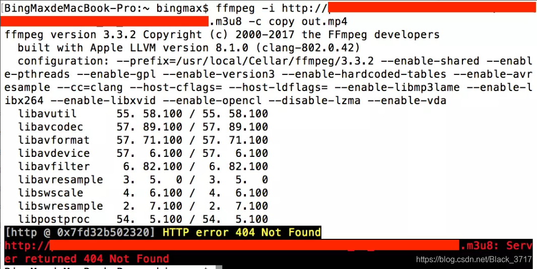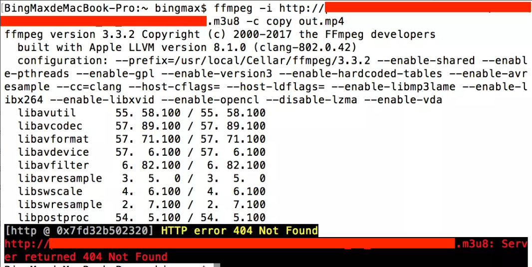 当直播关闭或者中断:该命令会中断执行,输出视频out.mp4至你的当前用户的文件夹(/Users/bingmax/out.mp4),并提示HTTP error 404 Not Found