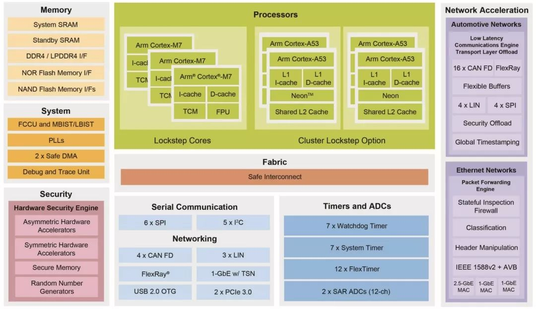功能安全:S32G提供ASIL D要求的处理器,包含支持同步模式(lock-step)的ARM Cotex-M7微控制器,以及多个ARM Cortex-A53应用处理内核的lock-step clusters功能。