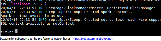 出现如下回显表示启动成功,这样我们就可以在下面scala控制台编写spark程序了。