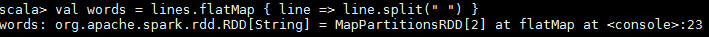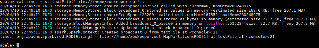 val lines = sc.textFile("file:///home/zookeeper.out");
