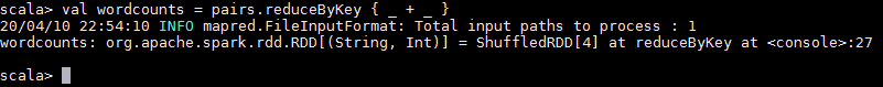 val wordcounts = pairs.reduceByKey { _ + _ }