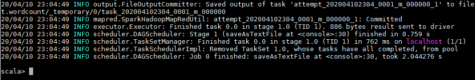 先删除/home/zookeeper.out.wordcount目录,再执行下方scala脚本