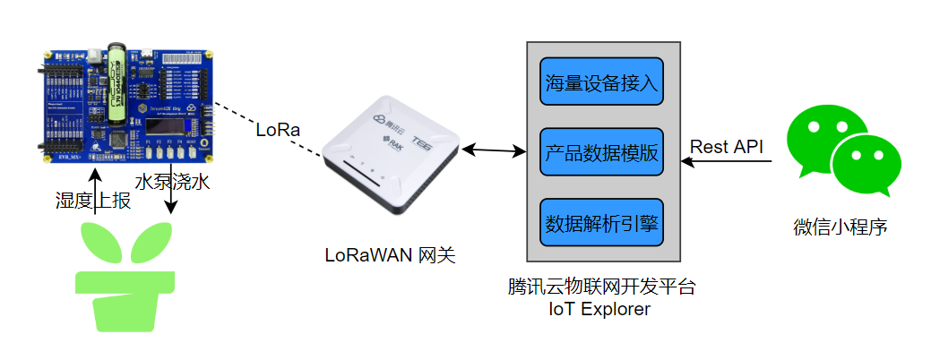 端侧通过 TencentOS tiny 定制 EVB_MX 开发板外挂一个湿度传感器和水泵,通过 LoRaWAN 模组及网关与腾讯云物联网开发平台进行通信,应用层使用微信小程序来查看湿度和控制水泵浇水。