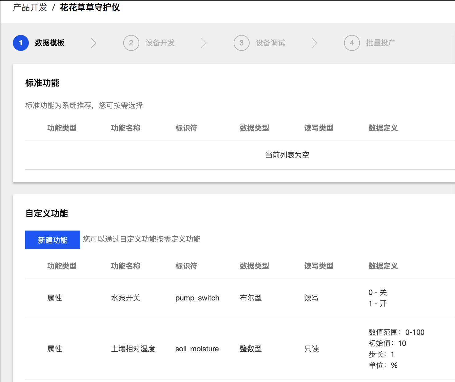 同时给“花花草草守护仪”定义了自己的数据模板,包含两个属性,一个水泵开关 pump_switch,一个土壤相对湿度 soil_moisture。