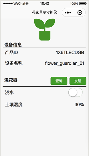 没过几天,小能手就基于腾讯云物联网开发平台做出来一个浇花器,随时随地打开微信小程序就可以查看盆栽的土壤情况,并且进行远程浇花。这样,长期出差的朋友,以及阳台路程达10分钟的业主们,都得以轻松呵护自己的花花草草。