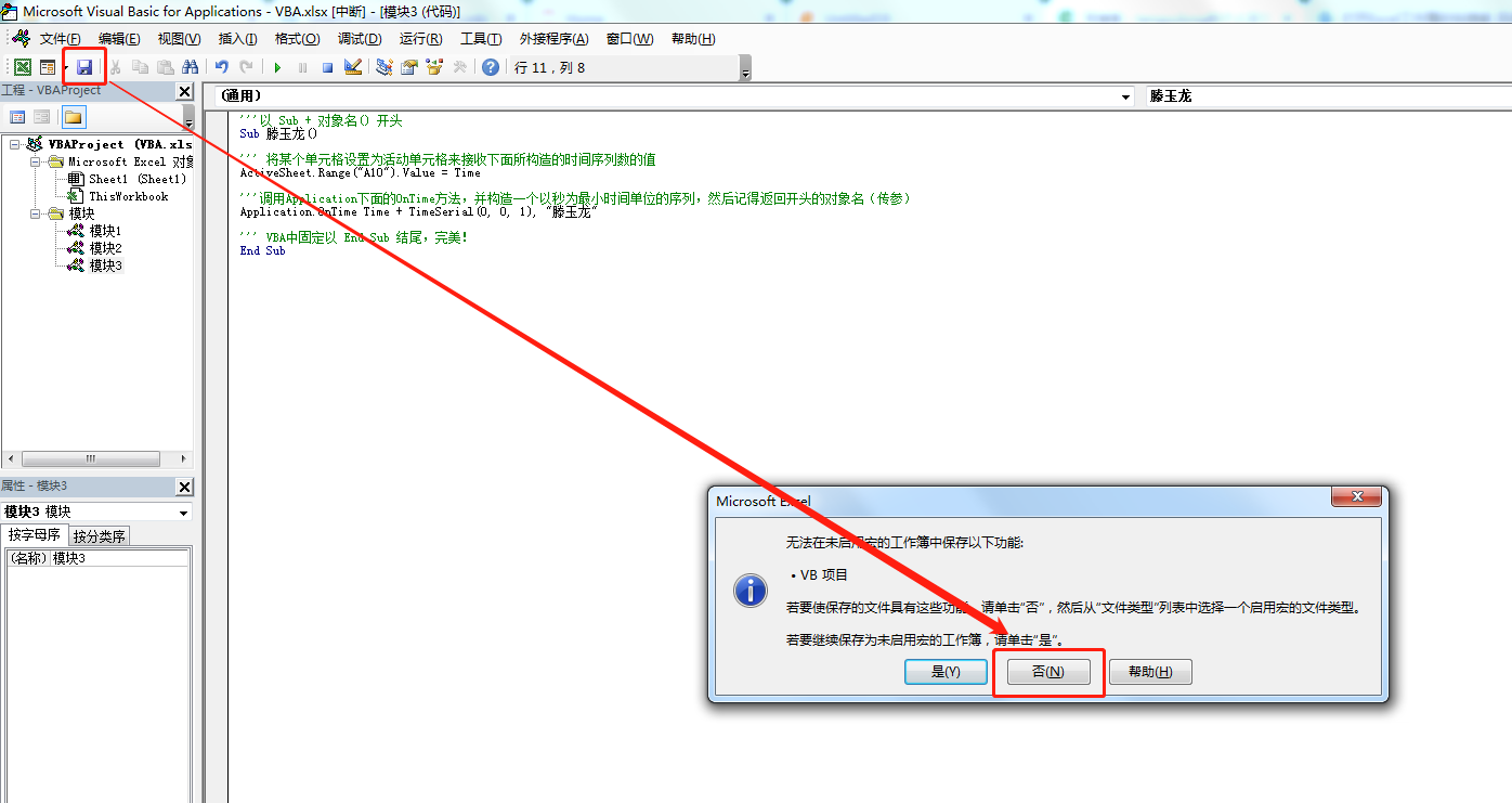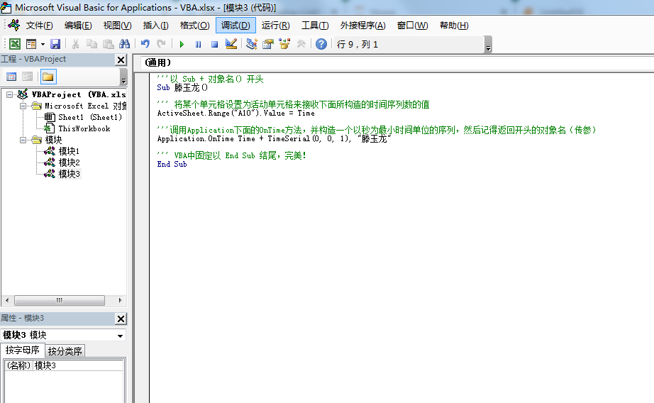 注:VBA代码通常是以 Sub 对象名() 开头,再以 End Sub 结尾。其中“对象名”可为英文字符,也可为中文字符。这个较其它语言奇特一点。