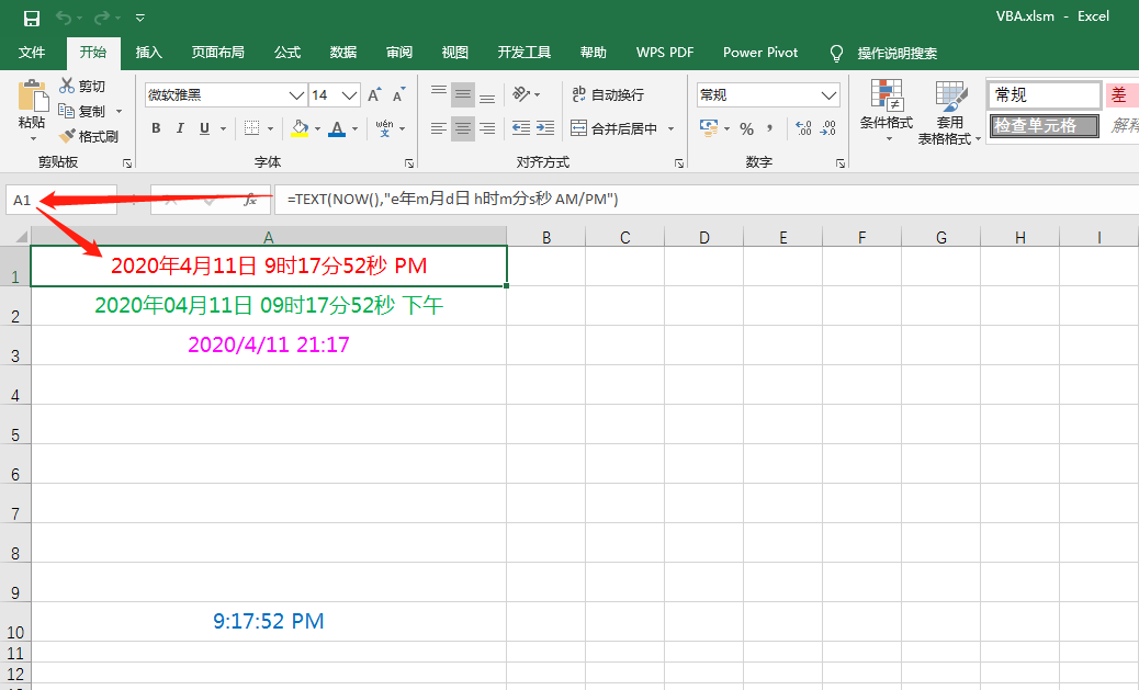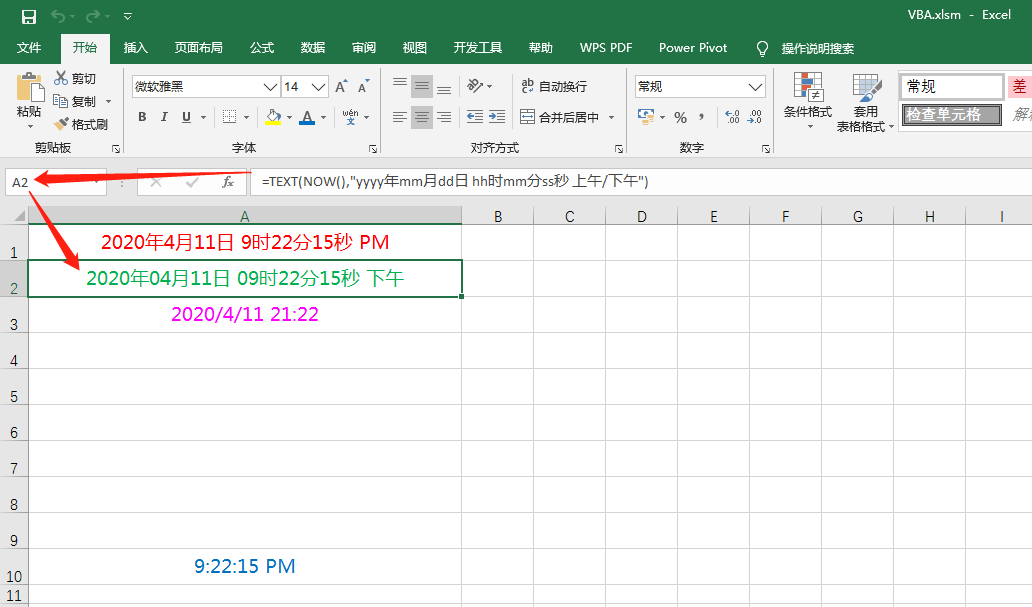 例2: 在A2单元格中输入 =TEXT(NOW(),"yyyy年mm月dd日 hh时mm分ss秒 上午/下午")