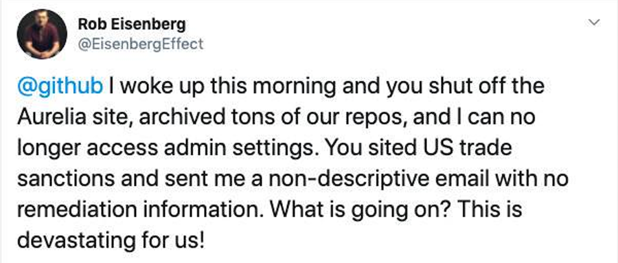 当3月24日Aurelia的前端项目被微软自己GitHub封禁时,在微软工作的Rob Eisenberg 还不得不通过发Twitter并知会GitHub的方式,来解决公司内部的问题。