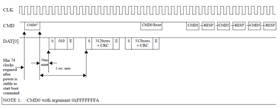 CMD 信号保持低电平不少于 74 个时钟周期,会触发 Original Boot Operation,进入 Boot State。