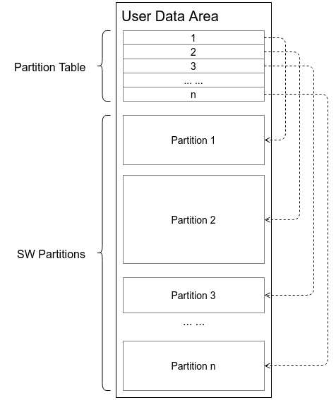 软件分区技术一般是将存储介质划分为多个区域,既 SW Partitions,然后通过一个 Partition Table 来维护这些 SW Partitions。在 Partition Table 中,每一个条目都保存着一个 SW Partition 的起始地址、大小等的属性信息。软件系统在启动后,会去扫描 Partition Table,获取存储介质上的各个 SW Partitions 信息,然后根据这些信息,将各个 Partitions 加载到系统中,进行数据存取。