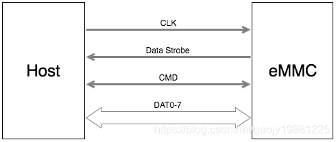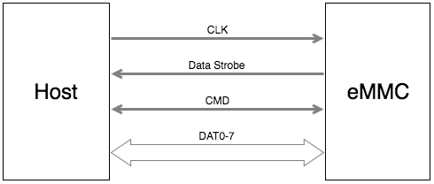 eMMC 总线中,可以有一个 Host,多个 eMMC Devices。总线上的所有通讯都由 Host 端以一个 Command 开始发起,Host 一次只能与一个 eMMC Device 通讯。