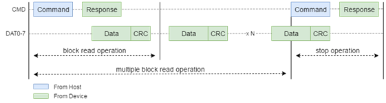 如果 Host 发送的是 Multiple Block Read 的 Command,那么 eMMC Device 会持续发送数据,直到 Host 主动发送 Stop Command。