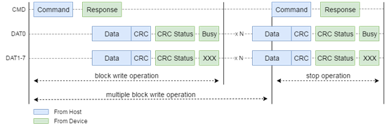 如果 Host 发送的是 Multiple Block Write Command,那么 eMMC Device 会持续地将接收到的数据写入到存储器中,直到 Host 主动发送 Stop Command。