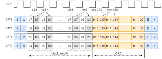 在 DDR 模式下,Data Line 在时钟的上升沿和下降沿都会传输数据,其中上升沿传输数据的奇数字节 (Byte 1,3,5 ...),下降沿则传输数据的偶数字节(Byte 2,4,6 ...)。