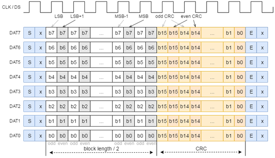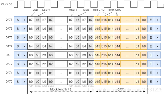 此外,在 DDR 模式下,1 个 Data Line 上有两个相互交织的 CRC16,上升沿的 CRC 比特组成 odd CRC16,下降沿的 CRC 比特组成 even CRC16。odd CRC16 用于校验该 Data Line 上所有上升沿比特组成的数据,even CRC16 则用于校验该 Data Line 上所有下降沿比特组成的数据。