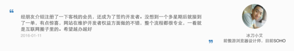 所以,我们要做的,并不是和某些平台比价格低,我们只要实打实地帮助企业客户快一个小时找到成功率最高的开发者,早一天完成项目开发上线;帮助开发者减轻和开发无关的一切事物,帮助维护他们的正当权益,让他们可以轻松凭开发能力而赚钱,他们就会回报我们以信任,支持,以及合适的经济收益。
