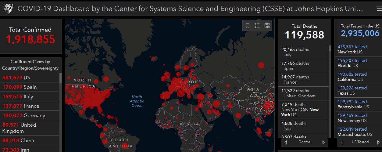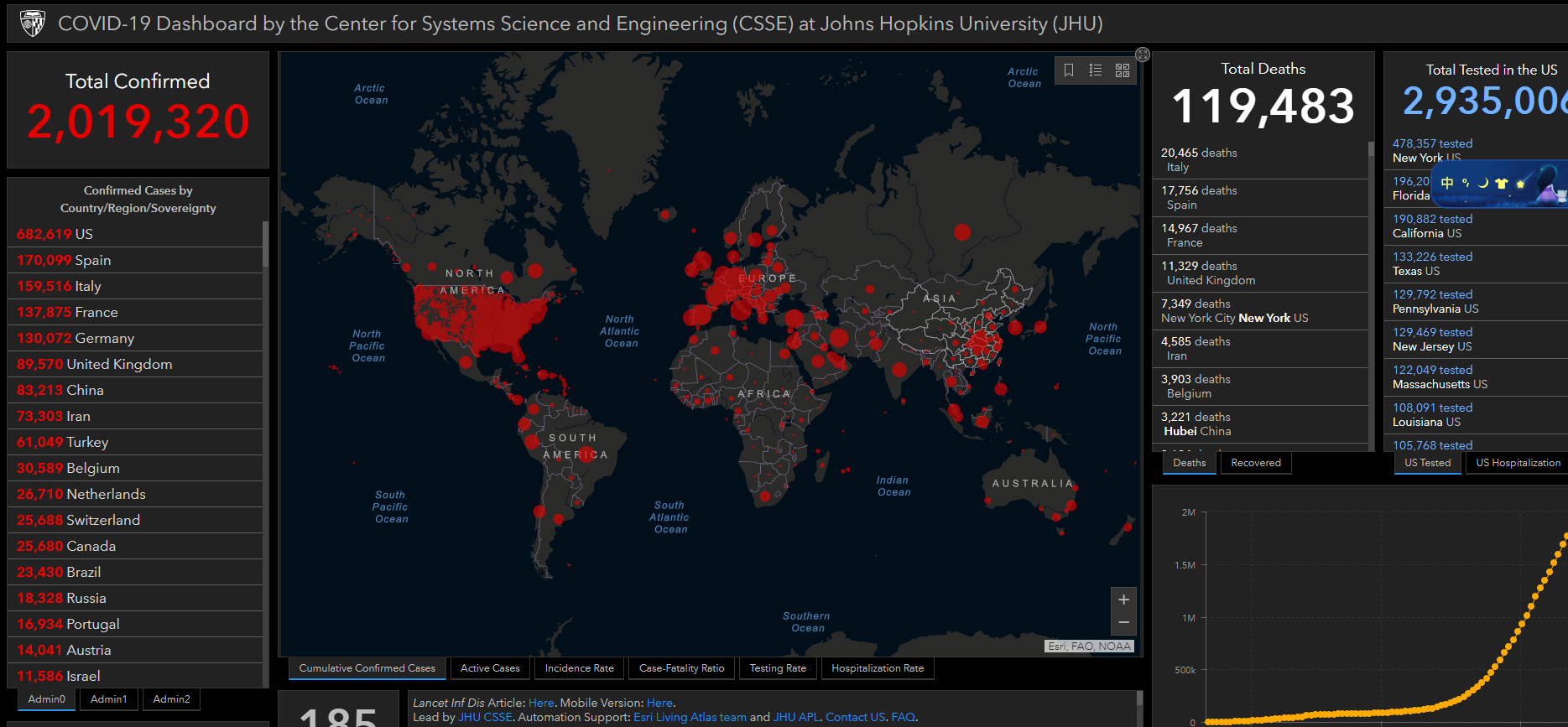 作为全球新冠疫情数据的实时统计的权威,约翰斯—霍普金斯大学的实时数据一直是大家实时关注的,也是各大媒体的主要数据来源。在今天早上的相当一段长的时间,霍普金斯大学的全球疫情分布大屏中显示,全球确诊人数已经突破200万。