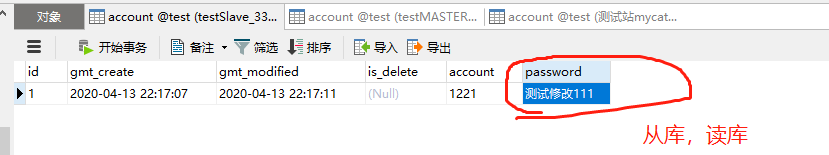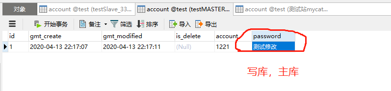 修改的正常处理就可以了,我就不再测试了。也这样正常使用事务,mycat是支持事务。(测试写的时候记得把从库数据改回和主库一样,我是为了测试才这样改的,不是正规操作)