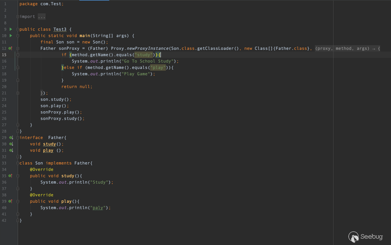 我们可以看到我们写了一个Son类继承了Father接口,然后在Test3类中的main方法中被实例化,接下来我们通过Proxy的newProxyInstance方法生成了一个Son对象的代理,我们传递了三个参数进去,Son类的类加载器和实现的接口,这里注意被代理的对像是一定要实现至少一个接口的,因为实例化的代理类本身是继承了Proxy类,所以只能通过实现被代理类接口的形式来实例化。最后我们通过匿名内部类的形式传入了一个InvocationHandler对象,InvocationHandler是一个接口,该接口中只有一个方法就是invoke方法,所以我们一定要重写该方法。