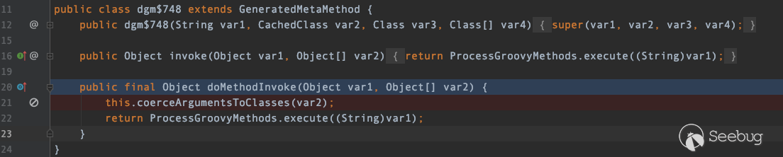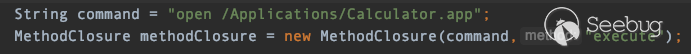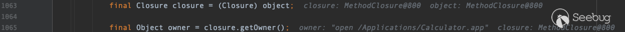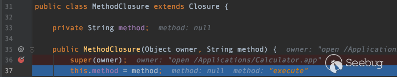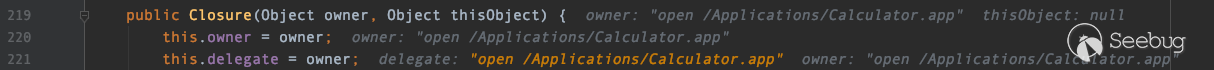 可以看到我们将要执行的命令传给了MethodClosure的父类来处理,将“execute”赋值给了MethodClosure.method属性。然后紧接着跟到Closure的构造方法中看到命令被赋值给了Closure.owner和Closure.delegate属性,之所以讲这些赋值过程是因为后面都会用得到。