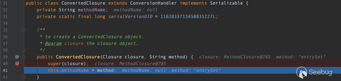 接下来payload中又实例化了另一个对象并将刚才实例化的MethodClosure对象和一个字符串常量“entrySet”传入,我们童颜继续跟进。