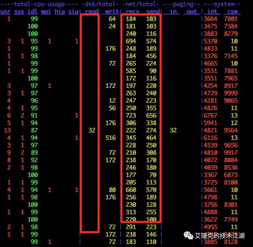 在一台真实的MQ上查看网络和磁盘,即使消息端一直从MQ读取消息,也几乎看不到进程从磁盘拉数据,数据直接从Page Cache经由Socket发送给了Consumer。