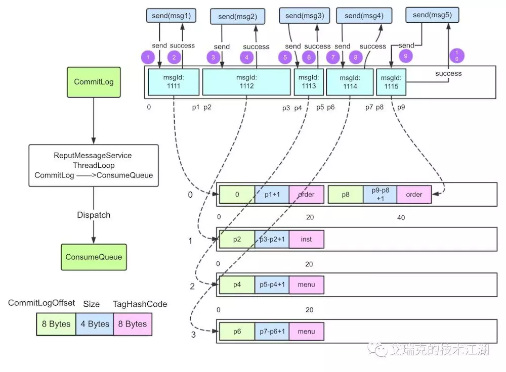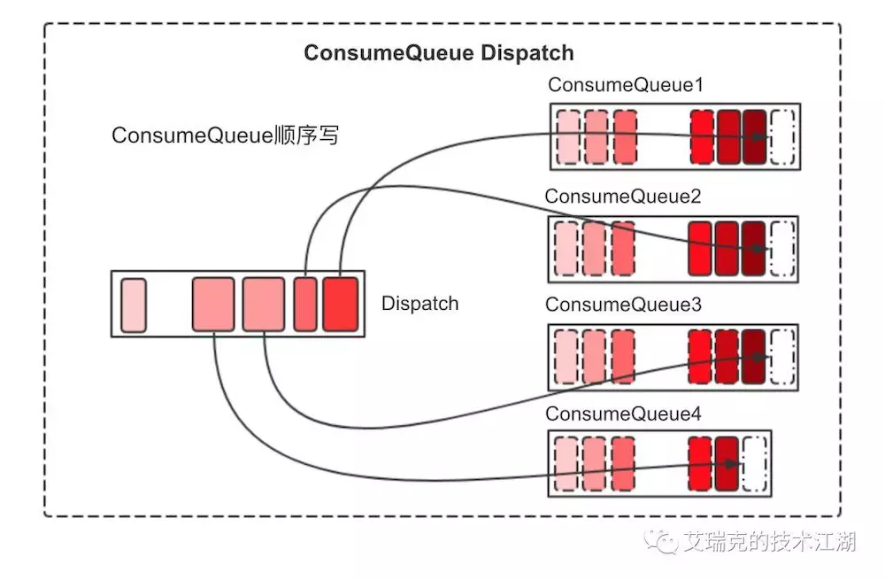 Commit Log持久后,会将里面的数据Dispatch到对应的Consume Queue上。