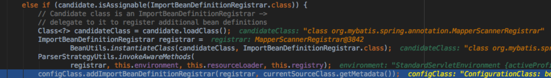 这里会去调用实现类的registerBeanDefinitions方法去加载bean。前面说过,MapperScannerRegistrar实现了接口ImportBeanDefinitionRegistrar,具有方法:registerBeanDefinitions。因此,加载mapper bean就正式开始了。