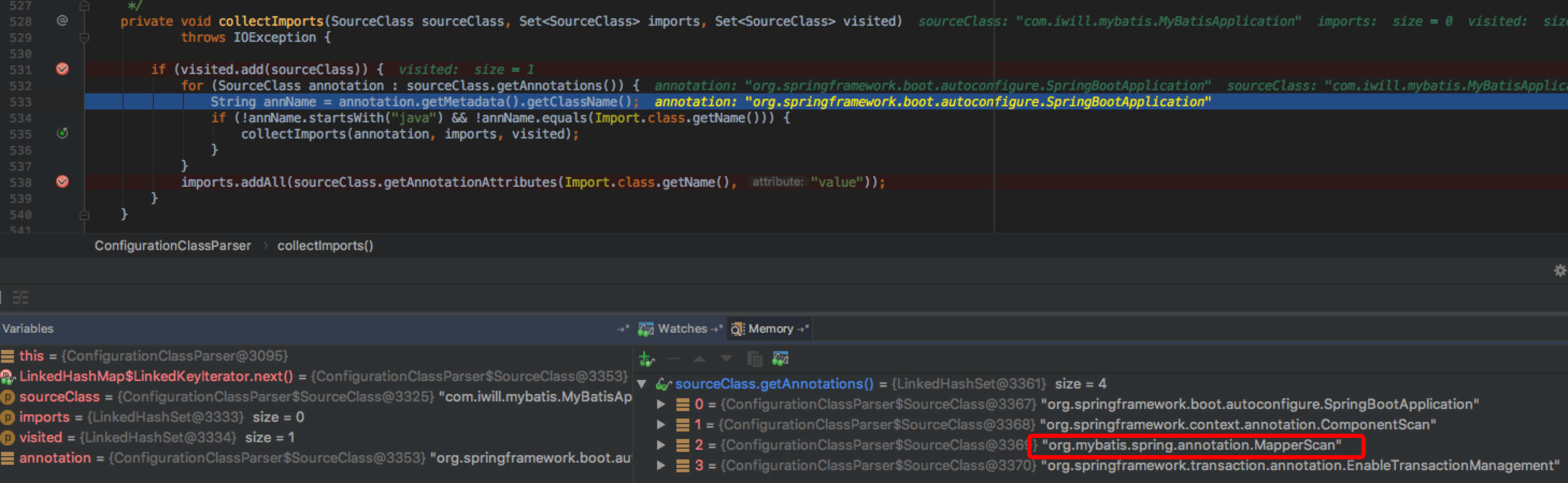 在加载MyBatisApplication的配置注解时,MyBatisApplication上的注解会被解析出来,如下: