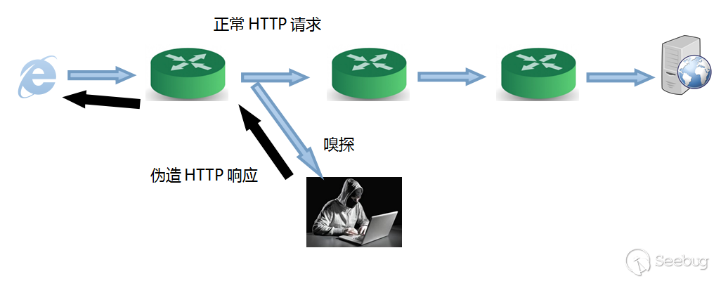 用旧作《某电商网站流量劫持案例分析与思考》[4]里面的一幅图来示意,攻击者嗅探到符合特征的流量后即伪造响应,这里是伪造了HTTP响应(为了篡改页面),如果只是阻断的话就是伪造rst包干扰TCP握手过程或者连接。