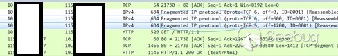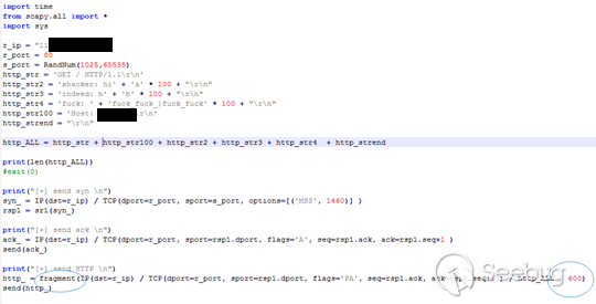 IP包也是支持分片的,原理类似,只是要构造IP包就需要用到Python下的组件Scapy,TCP三次握手后用Scapy的fragment函数按600字节一个拆分发送IP分片包(当然也可以把syn包也分片),代码如下: