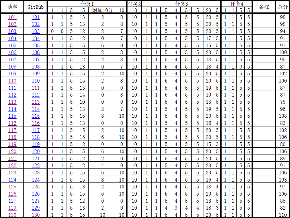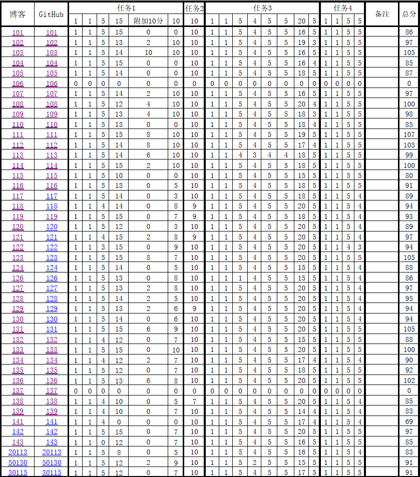 以下是学号及博客链接:1030130、1030118、1030120、1030126、1010103、1010131、1010111。