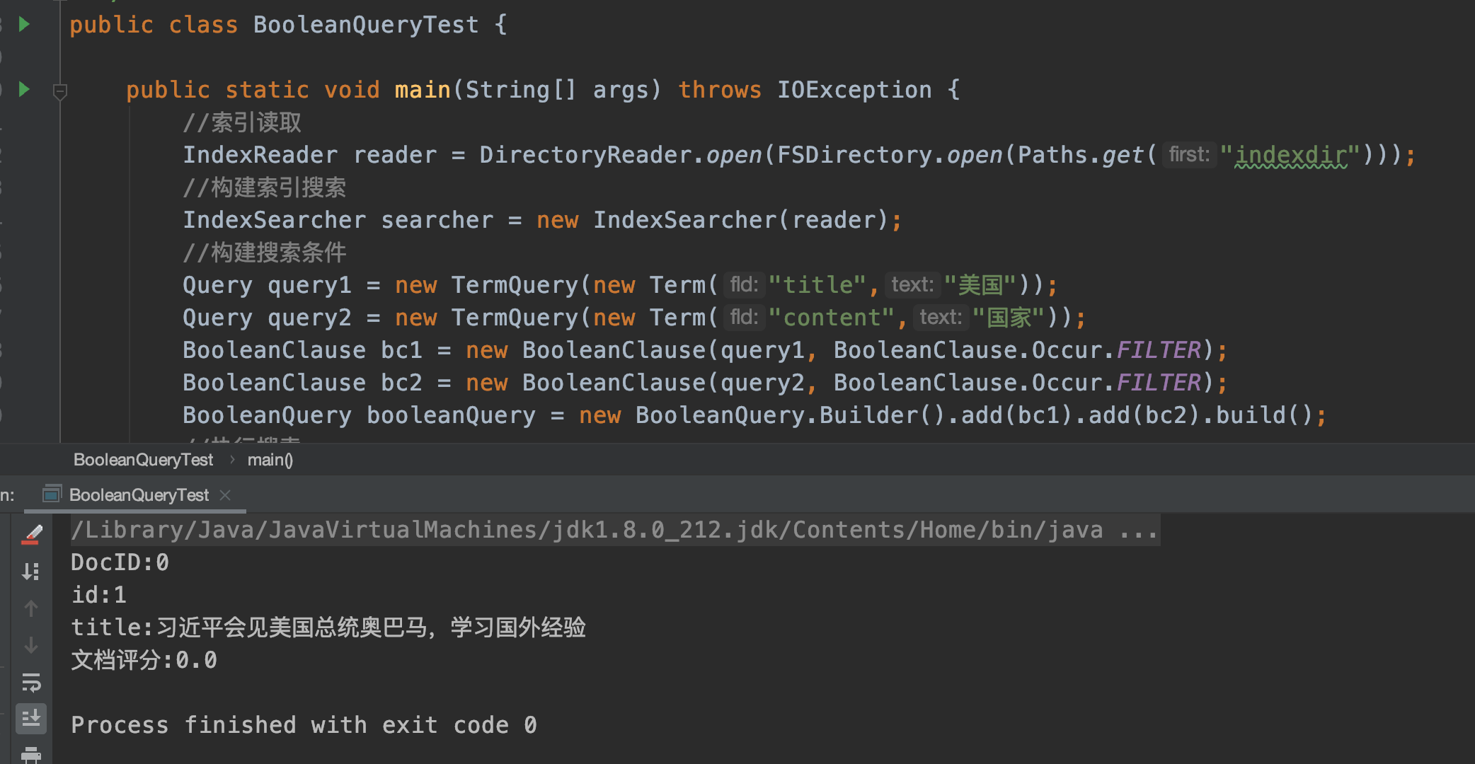 BooleanQuery实际开发中常用到的一种Query查询,它其实是一个组合的Query,在使用时可以把各种Query对象加进去并标明他们之间的逻辑关系。BooleanQuery本身是一个布尔子句的容器,它提供了专门的API方法往其中添加子句,并标明他们之间的关系。多个关键词匹配搜索的业务场景不少,代码如下,简单的例子。