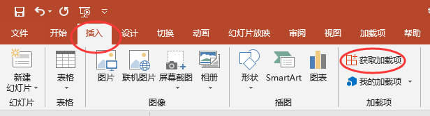 打开PPT,“插入”模块找到“获取加载项”,老版本的是“应用商店”