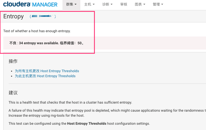 CDH 集群,出现 Entropy 不良问题,原因是系统熵值低于 CDH 检测的阀值引起的, 所以解决思路是需要调大系统熵值。