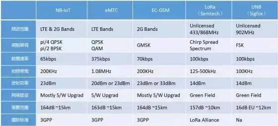 NB-IoT和其它低功耗广域网的技术对比: