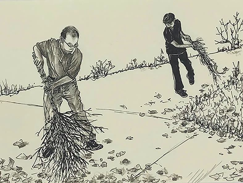 跟爸爸一起,清扫丧事后的鞭炮残渣。