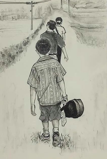 来年春天的稻田旁,祖孙三人走在田埂上。