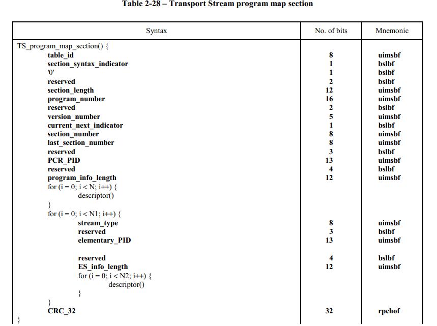 PMT表的协议根据标准ISO/IEC 13818-1 section 2.4.4.8如下表所示: