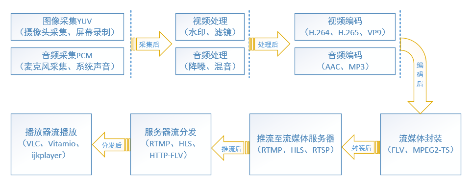 - 最后就是通过流传输协议将封装好的内容推送到流媒体服务器上;