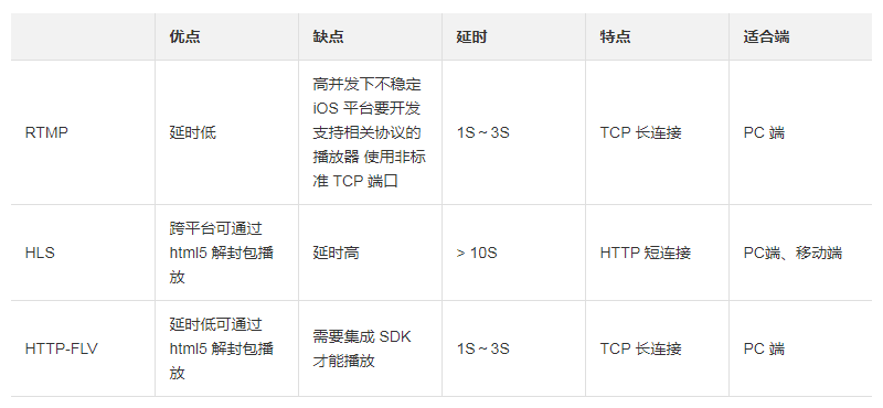 RTMP、HLS、HTTP-FLV 协议对比如下图所示: