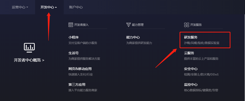 沙箱环境是支付宝给开发者提供的测试环境,里面包含了沙箱应用、沙箱账号、沙箱工具等,登录支付宝开发平台之后,进入沙箱环境的入口如下图所示。