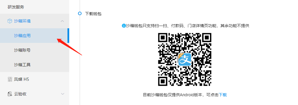 沙箱钱包是我们用来做测试的软件,跟支付宝一样,只不过只有基本功能,另外不用说了,沙箱钱包里的钱都是虚拟的,我们可以通过扫码下载或点击下载之后安装到自己的手机上,需要注意的是,目前只有安卓版的。