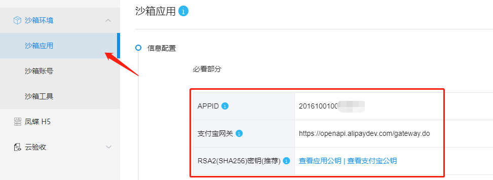 - 记下APPID和支付宝网关,后面配置支付功能时需要用到